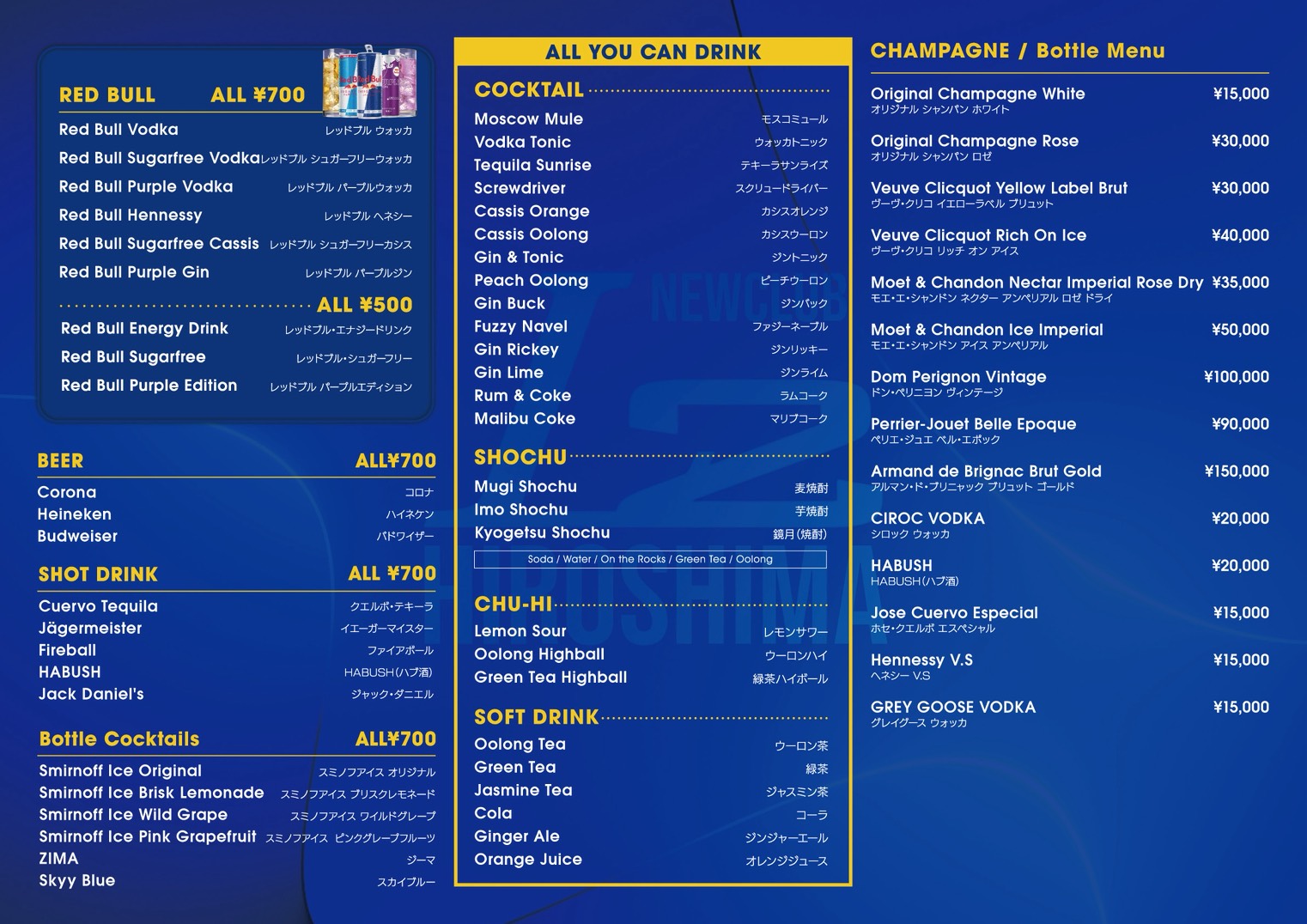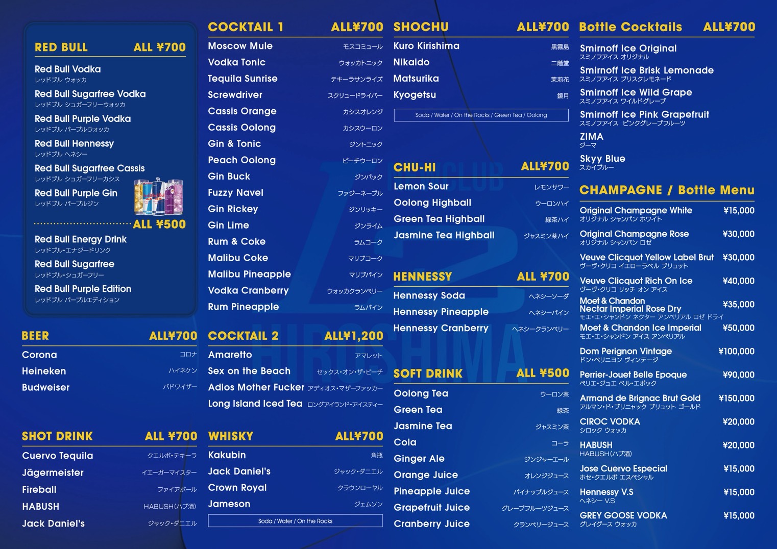 ¥300,000(+Tax) ・スタッフ×5名付 ・機材貸出し込み ・音響スタッフ付 ・DJ×1名(要望有れば) ・VIP5席貸切 |